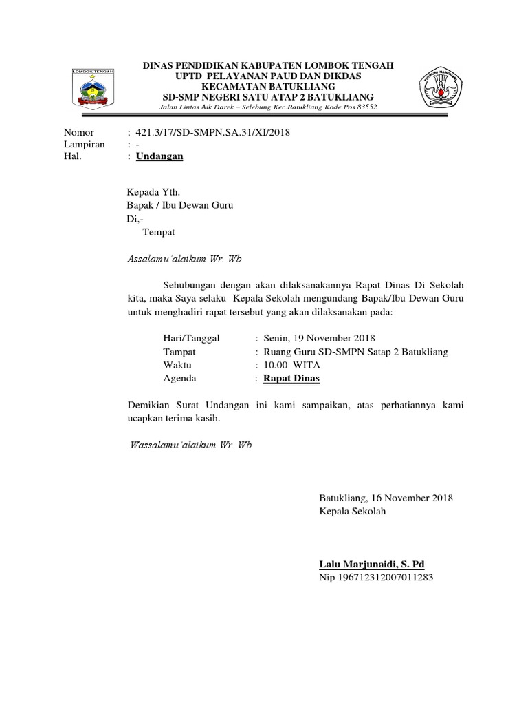 Ketika kamu hendak mengadakan sebuah kegiatan baik itu organisasi, instansi, pendidikan atau perusahaan, pasti kamu harus membuat surat undangan rapat. Contoh surat undangan rapat dinas dikes.badungkab.go.id. 4 contoh cv dalam bahasa inggris yang baik dan benar beserta artinya. Undangan ini menggunakan bahasa resmi serta penyampaiannya sopan sesuai kaidah kedinasan. Tentunya untuk menghindari ketidak hadiran para undangan. Contoh surat undangan untuk kepala dinas pendidikan. Surat dinas adalah surat yang dikeluarkan oleh lembaga resmi yang ditujukan untuk menginformasikan suatu pesan kepada orang yang dituju melalui media surat resmi. Dalam melaksanakan proses belajar mengajar di sekolah, maka tentu semua komponen harus bekerjasama dengan baik. Di bawah ini adalah contoh surat dinas undangan rapat sekolah yang bisa anda pergunakan sebagai bahan referensi. Diharapkan dengan contoh surat undangan rapat dinas sekolah terbaru 2017 ini bisa menjadi referensi yang sesuai untuk anda terapkan disekolah anda. Contoh surat undangan rapat orang tua wali murid di sekolah dalam format word dadang jsn Untuk lebih jelasnya seperti apa surat undangan dinas yang resmi silahkan lihat dibawah ini. Dalam membuat surat dinas hal yang perlu diperhatikan yakni perihal apa yang menjadi pokok dari undangan tersebut, misalkan anda seorang kepala dinas pendidikan anda mau mengumpulkan kepala sekolah yang ada di naungan anda, anda perlu menyertakan kepentingan apa yang akan dibahas.